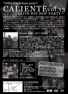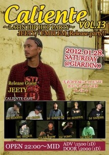 管理人様、告知失礼します。 不適切でしたらお手数ですが削除願います。 新年明けましておめでとうございます。 今年もCALIENTEは全開でいくぜ〜〜!! 一発目はESP ENTERTAINMENTよりJEETY「EMBLEM」リリースパーティーです!! チケット必要な方は気軽にメッセージしてください 2012年もぶっ壊れていきましょう!! CALIENTE VOL.13 〜LATIN.HIP HOP PARTY〜 2012.1.28.(SAT) OPEN 22:00〜MID @GIARDINO ADV \1500(1D) DOOR \2000(1D) 「EMBLEM」Release party!! Release Guest JEET