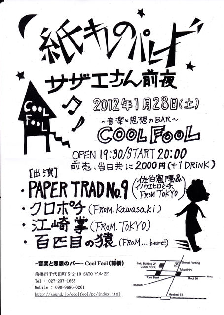初めまして今回の企画者くるくるぱー子と申します。 9月にCool Foolに初めて行きまして、その魔力に鳥疲れた新参者です。 よろしくお願いいたします。 放任管理人様が皆様でお好きなようにとのことですので、勝手に告知をば失礼致します。 ■2012年1月28日(土) ☆紙切れのパレード☆ 〜サザエさん前夜〜 Place: 〜音楽と思想のBar〜 Cool Fool(前橋) 出演: ・PAPER TRAD NO.9 /佐伯憲陽&イノウエヒロミチ(From東京) ・クロポチ (From川崎) ・江崎掌 (From東京) ・百匹目の猿 開場:19:30 開演:20:00