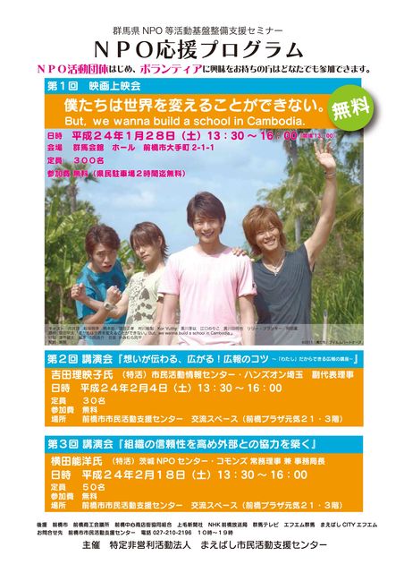 『NPO応援プログラム』3回連続セミナー(参加無料) ボランティアに関心をお持ちの方やNPO活動を行なっている方へ 第1回『僕たちは世界を変えることができない。』上映 (向井理、はじめての映画主演作品) 平成24年1月28日(土)13:30〜 (開場:13:00) 会場 群馬会館 ホール 第2回『想いが伝わる、広がる!広報のコツ』講演 平成24年2月4日(土) 13:30〜16:00 会場 前橋市市民活動支援センター 第3回『組織の信頼性を高め外部との協力を築く』講演 平成24年2月18日(土