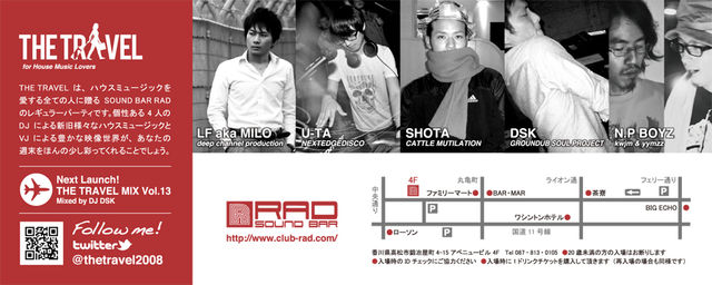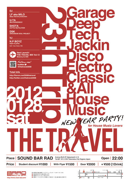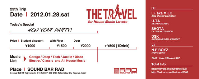 THE TRAVEL -23TH TRIP- 2012.01.28.SAT 22:00 START at SOUND BAR RAD 学生 1000円[ドリンク別] フライヤー提示1500円[ドリンク別] 当日2000円[ドリンク別] 入場時に1ドリンクチケット(500円)を購入していただきます ■The Travel Crew DJ:LF aka MILO/U-TA/SHOTA/DSK VJ:N.P. BOYZ [山弐ユウヂ × kwjm] STAFF:YUKA/SHOKO/IRIE ■twitter https://twitter.com/thetravel2008