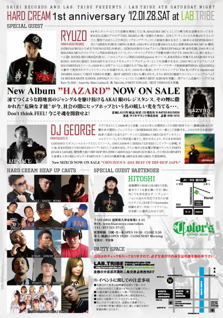 京都LAB TRIBEでの HIPHOP PARTY HARD CREAMが 28日に1周年!!!! 今回 SP GEUSTに うちの1200人超の WORLD WIDE PARTY でもお世話になったRYUZOさんなど 最高な方々揃い!! 滋賀からもお世話になっている MARさんが出演されるなど 最高の夜になる事間違いなしです!! 是非来てみる価値あり!!!! そして有難い事に 今回1周年に ゲストBARTENDERとしてCOLOR'Sに お声をかけて頂きました!! 存分に楽しんで頑張りたい思い!! 28日スケジュー