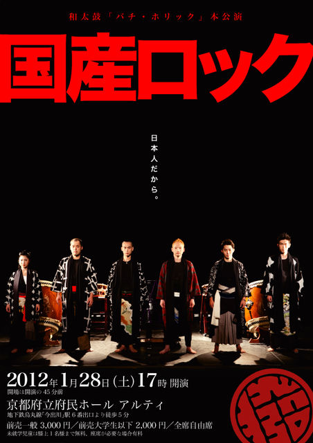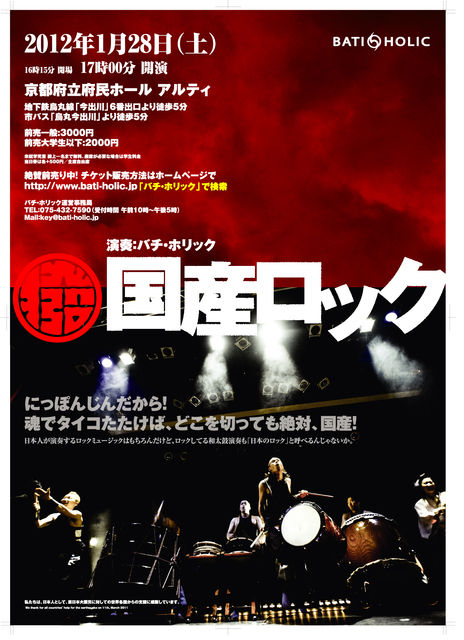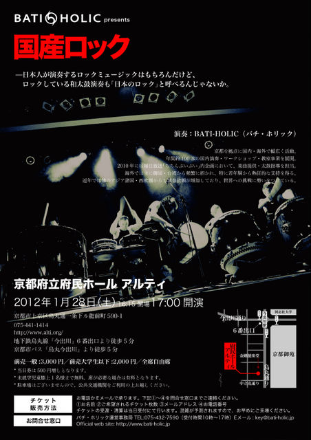 ●公演名:バチ・ホリック本公演「国産ロック」 http://blog.livedoor.jp/bati_holic/archives/2011-12.html#20111205 ●日程 : 2012年1月28日(土) ●時間 : 開場16:15 開演17:00 ●料金 : 前売一般3000円 当日3,500円/ 大学生以下2,000円 当日2,500円 【全席自由】 (未就学児は膝上1名様まで無料。席が必要な場合は有料となります) ●会場 :京都府立府民ホールアルティ http://www.alti.org/ (地下鉄烏丸線「今出川」6番出口より徒歩5分 京都市バス「烏丸今出川」より徒歩5分)