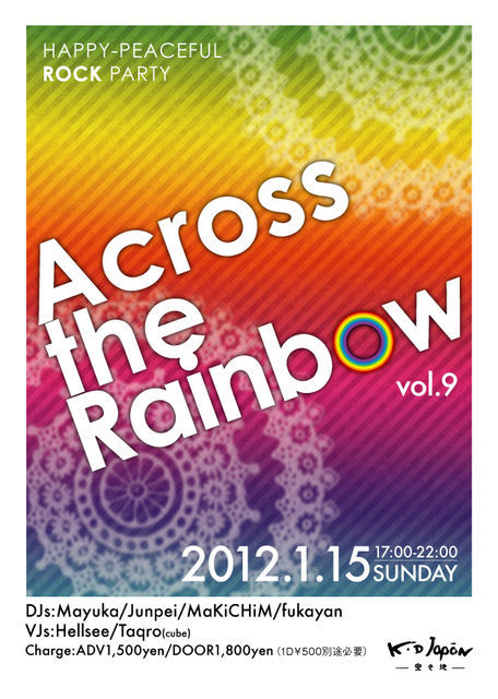 2011年、Preasure of ROCKSに来ていただいたり、 UStreamを見ていただいたり、また告知に協力していただいたり 「あー、一回行ってみようかな」と思っていただいたりした方、 そしてそうでない方もありがとうございました!! 12月の頭にPoR2歳の誕生日を祝っていただきまして 今回からついに3年目に突入します!! vol.13のFriend DJsは、 なんと名古屋の人気イベント「Across the Rainbow」から来てもらいます☆ そして、もう一人は一年ぶり二回目の登場! Mayuka (Across the Rainbow) &二毛作 (TK KNIGHT)です!! Across Th