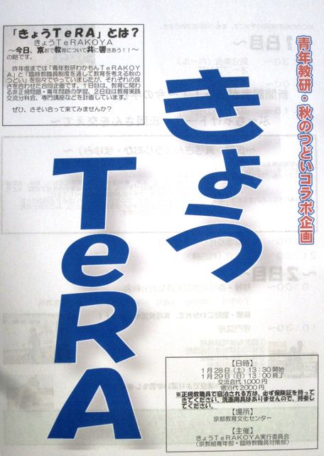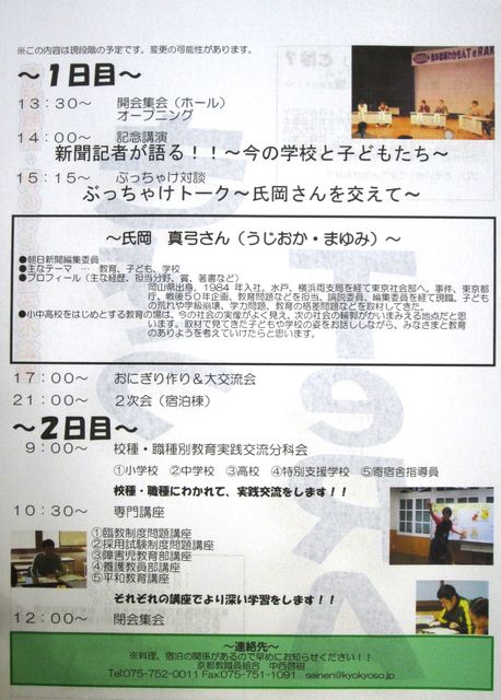 【概要】 詳しくは、写真データでどうぞ。 1/28(土) ◆13:30〜開会集会 ◆14:00〜記念講演(朝日新聞記者、氏岡真弓さん) ◆15:15〜ぶっちゃけ対談(青年、臨時、ベテラン、保護者の方を交えて) ◆17:00〜おにぎり作り&大交流会 ◆21:00〜二次会(宿舎にて) 1/29(日) ◆9:00〜(校種・職種別)教育実践交流分科会 【?小?中?高校?特支?寄宿舎】 ◆10:30〜専門講座 【?臨教制度問題、?採用試験制度問題、?障害児教育部、?養護教員部、?平和教育】 ◆12:00〜閉会集会 ※交流会代:\1000 ※二次会代:\500 ※宿泊代:\