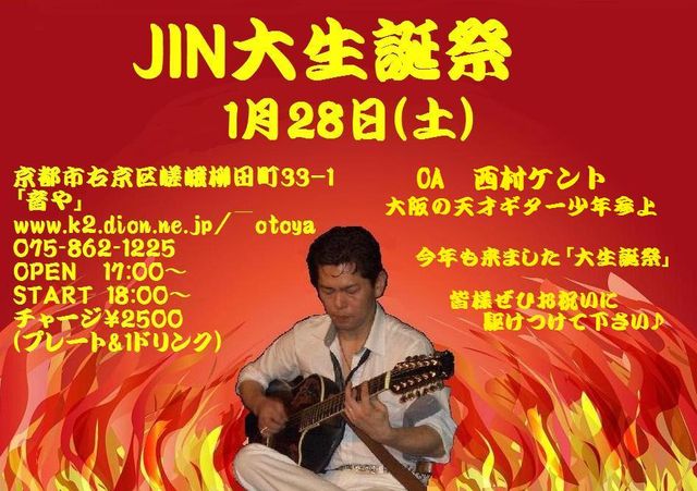 『カリスマギタリストJIN 大生誕祭』 京都市右京区嵯峨柳田町33-1 「音や」 075‐862‐1225 http://www.k2.dion.ne.jp/~otoya OPEN 17:00〜 START 18:00〜 チャージ\2500(プレート&1ドリンク) OA 西村ケント (大阪の天才ギター少年) 年に一度の大生誕祭 皆様ぜひお祝いに掛けつけて下さいませ 追加ライブ等はホームページから http://www.cb-music.net インターネットラジオ「C&B天国」毎週金曜日24時〜25時 http://www.fm-gig.net/top.html