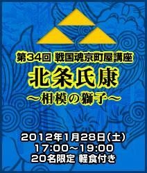 第34回となります今回の武将は、武田信玄・上杉謙信と渡り合い関東に大版図を築いた相模の獅子・北条氏康についてです^^ 軍事・内政・外交いずれにも手腕を発揮し 領民からも慕われた名将・氏康の生涯をご紹介となります。 参加券は戦国魂Web本店にて現在発売中です。 皆様のご参加を心よりお待ちしております^^ <記> ■日時:2012年1月28日(土) 17:00〜19:00 ■題目:「北条氏康 〜相模の獅子〜」 ■場所:戦国魂京町家本陣(京都市中京区丸太町釜座通下る枡屋町164-1) ■アクセス:京都市営地下鉄・丸太町駅下車西へ徒