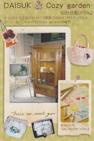 はじめまして!! 岩手でCozy garden(コージーガーデン)というお店をやっているKanaeと申します。 この度仙台青葉区春日町にある『メリーメリークリスマスランド』さんのレンタルスペースをお借りして『DAISUK(だいすき)』さんと『イラストレーターすがわらよしえ』さんとコラボイベントを行います♪ 日時 H24.1/28(SAT)〜1/29(SUN) 1/28 12:00〜19:00 1/29 11:00〜17:00 すがわらよしえさんのワークショップもあり