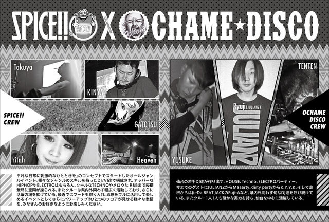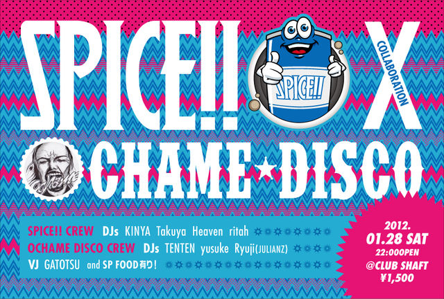 管理人様、告知失礼致します。 今年6周年を迎えるオールジャンルイベント『SPICE!!』と、昨年のスタートからすさまじい勢いで盛り上がっている新世代イベント『OCHAME☆DISCO』のコラボレーションパーティー!! 当日ご来場いただいた女性の方には、『すだち酒』もしくは『ゆず酒』を1Dサービス!! また、SPICE!!特製スパイスを使ったフードも数量限定でご用意しています!! 幅広い世代と様々なジャンルの音楽が飛び交う、まさにオールジャンルパーティー!! クルー一同、皆様のご来場をお待ちしてます!! SPICE!!〜all mix party〜 × O
