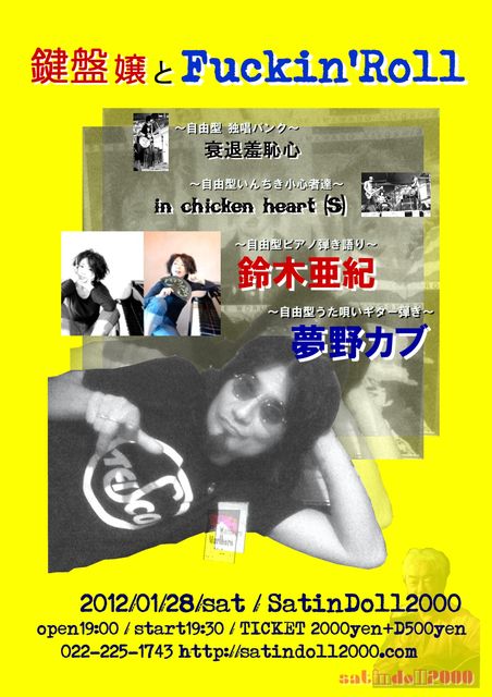 「鍵盤嬢とファッケンロール!」 〜夢野カブ&鈴木亜紀 東北4カ所ツアーしょの弐 仙台篇〜 遅まきながら、あけましておめでとうございます。 夢野カブさん、今年初の仙台ライブ、来週末、1/28(土)です。 是非是非あそびに来てくださいね! サテンドール2000 blog より 「もう本当にカブさんは仙台に移住したら?と思うくらい仙台を気に入り、気にし続けてくれています。毎回新しい「息吹を」仙台に持ち込んでくれます。「鈴木亜紀」期待しちゃいますね!!!1月28日また新しい出会いが!!!期待してください!!!」 http://love