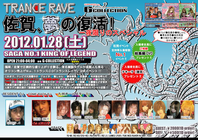 ★★★★★★★★★★ 佐賀の動員記録を更新してきた 支持率&集客数 『No.1』イベント!! 伝説の「レイヴ佐賀」 一夜限りの復活!! -------------------- ●ジョイ ●佐藤歩 ●梅しゃん ●澤本幸秀 ●桜井莉菜(さくりな) ●川端かなこ ●ろみひなど 超人気モデル総出演の ●「総集編DVD」 (2枚組)と 復活の ●「ウェルカムテキーラ」など 入場者全員にプレゼン