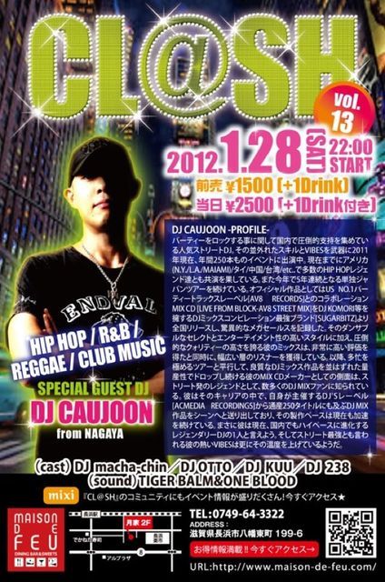告知失礼します。 明けましておめでとうございます! さぁ、今年1発目長浜CLUB EVENT 「CL@SH vol.13」開催決定しました(^-^)/ 毎回、豪華ゲストDJを招いて爆発的な盛り上がりになっています☆ そして、今回のSpecial Gest DJは何と!!!!! From Nagoyaから!!! あの全国的なBig Name!!! DJ CAUJOON♪───O(≧∇≦)O────♪ が、来滋賀、来浜です!!!!! 名古屋を中心に全国のパーティーでフロアをロックし続ける日本の代表的DJが長浜でPlayする事はそう滅多にあり