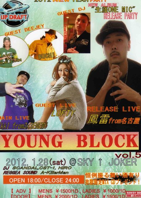 告知失礼します。 3×3ENEMY PRESENTS 『YOUNG BLOCK vol.5』 2012.1.28(Sat) @ SKY JOKER 18:00~24:00 ADV:1500/DOOR:2000 ≪GUEST LIVE1≫ 鳳雷 ≪GUEST LIVE2≫ LOFTY ≪GUEST DEEJEY≫ LAVER a.k.aNORISAN BUCHI ≪GUEST DJ≫ DJ TG ≪MAIN LIVE≫ IKKI from 3×3ENEMY ≪LIVE≫ C-BOY HIROYA AKINNA YUKKO R.I.P CREW ≪DJ≫ SCANDAL CST-1 HIRO ≪REGGAE SOUND≫ UP DRAFT A-KillerMan ラバダブもやるから歌いたい方も来てください‼ お待ちしてます‼