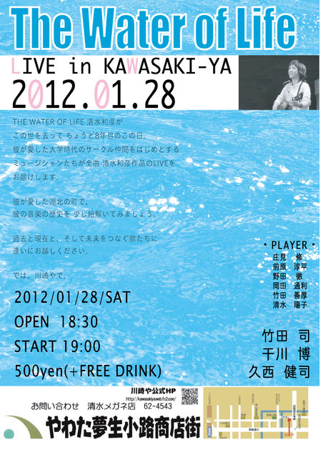 清水君の地元、長浜の若手ミュージシャンから「WOLの歌だけのライブをしてほしい」というなんとも素敵な声があがり、そしてそれに賛同してくれた仲間たちによるライブを行うことになりました。 1月28日(土) 「THE WATER OF LIFE」 場所 「川崎や」 :滋賀県長浜市大宮町8−8 ご予約0749-62-4543 18:30開場 19:00開演 チケット/500円(フリードリンク付き) 出演/竹田司・干川博・久西健司 /庄見修・前原淳平・野田徹・岡田通利・竹田善厚・清水陽子 長浜にある町屋を改造して作られた、小さなライブハウスです。