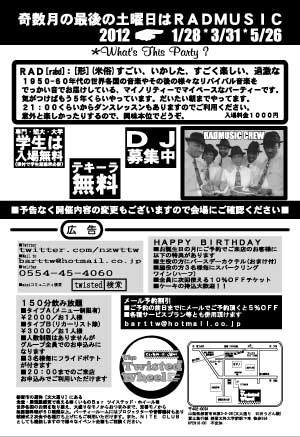 【RADMUSIC】 2012/1/28/sat 22:00-(21:00頃から簡単なダンスレッスンあります) @都留ツイステッドホイール コミュニティー http://mixi.jp/view_community.pl?id=220942 ブログ http://ameblo.jp/barttw 入場料金1000円 ※専門・短大・大学等の学生は無料 (受付で学生証提示の必要) T古着やビンテージ・レトロなものが好きな方はドツボなDJパーティーです アメリカンオールディーズやジャマイカンオールディーズやその後の各種リバイバルなどをでっかい音とそこそこ広いダンスフロアでお楽しみ頂けます ダンス