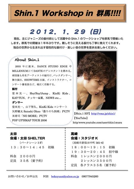 1年半ぶり! Shin.1さんのワークショップin群馬が開催されます! 現在、主にジャニーズの振付師として活躍中です。 難しそうに見える振付も丁寧に分かりやすく教えてくれます。 独自の世界から生まれ出す個性的な振付け・楽しい音の世界を是非お楽しみください。 貴重な機会ですので、是非ご参加ください☆ 《in太田》 ・日時―2012年1月29日(日) 13:30〜14:45 初級 ・場所―太田SHELTER(パークレーン3F) ・料金― 2000円 ・定員―クラス35名(※要予約※) 《in高崎》 ・日時―2012年1月29日(日