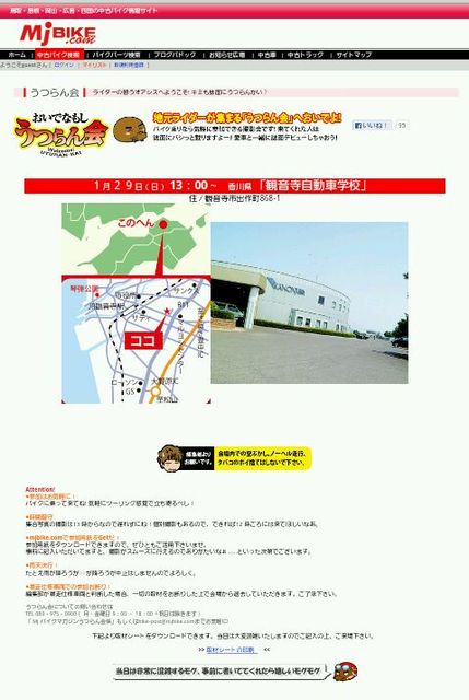 バイク雑誌『Mjバイク』の撮影会があります! 皆で写りに行きましょ( ̄∇ ̄*)ゞ 集合場所 南国の道の駅『ふらり』 時間 9時30分集合 集まりしだい出発 お昼は撮影後にどこかで… うどん 下道で行きますd(・▽・) 若葉マーク持参でお願いしますヘ(≧▽≦ヘ)♪ 寒波が来ています... もし… 前日、高速道路が通行止め(雪)なら○○にします(ーー;)