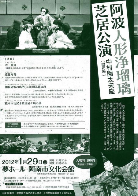 新野町に伝わる人形座「中村園太夫座」による人形浄瑠璃公演 演目は 式三番叟 恵比寿舞 絵本大功記十段目尼崎の段 新野中学校民芸部 の人形操作で「傾城阿波の鳴門巡礼歌の段」 チケットは前売り当日とも100円 高校生以下は無料です 現代仮名遣いの床本を無料配布 スクリーンに字幕を投影 大和先生による解説もあります 郷土の誇り、人形浄瑠璃をご覧ください