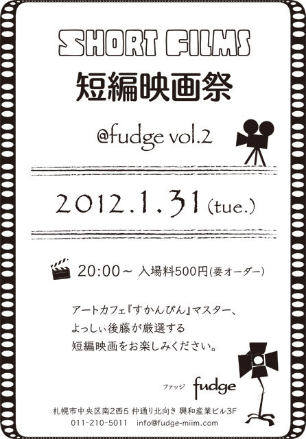 短編映画祭@fudge vol.2 1/31(mon.) 20:00〜 入場料:500円(要オーダー) カフェバー「すかんぴん」マスターであり、 脚本家でもあり、ショートムーヴィや音楽にはウンチクのある後藤ゆうすけさんによる 選りすぐりの短編映画祭です。 5分から10分くらいの作品、およそ10本あまりを上映予定です。 去年2月に初めてやってもらって、大好評! 一年ぶりにfudgeで再び〜です。