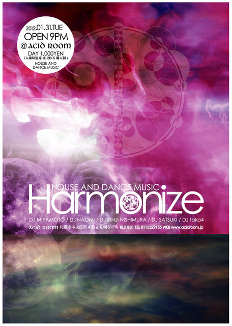1月31日(火曜日)は「Harmonize」です! HOUSEを主体としたパーティーです! スタートの時間も早いので、ゼヒゼヒ遊びに来てください HOUSE&DANCE MUSIC Deep Jackin Tech Progressive Space Minimal etc・・・ 「Harmonize」 @ACID ROOM (札幌市中央区南4条西6丁目札幌タイキビル地下3階) TEL:011-532-9155 2012年1月31日(火曜日) OPEN21:00〜 DAY ¥1000(別途入場時1DRINK購入制) DJs MIYAMOTO NAOMI KINJI NISHIMURA SATSUKI taka4