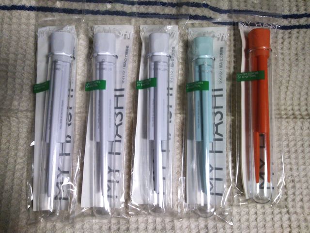 BENETTON のマイハシ 新品未使用 5本あります。 【色の内訳】 ホワイト 3本 オレンジ 1本 ライトブル- 1本 プラスチック試験管の中に組み立て式のハシが入っているタイプのハシが5本あります。 持ち歩きマイハシでもお弁当用にも使えると思います。 ゴムキャップ兼箸置きに差して入れるので持ち運びしてもカチャカチャ鳴りません。 【ご応募について】 1本だけでも、まとめて5本でも色を明記してコメントお願いします。 【発送方法について】 本数にもよりますが、ギリギリメール便でいけそうなので1本でも5
