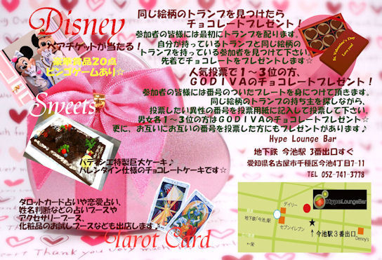 2月4日はハッピーバレンタインパーティです♪ おしゃれなLoungeBar貸切で立食パーティします* バレンタインなので、デザートはパティシエ特製の巨大チョコレートケーキ☆ 特別企画として、お客様へGODIVAのチョコレートプレゼントの企画や、 ディズニーペアチケットが当たるビンゴゲームもあります! 更に、占いやアクセサリーのブース出店、ELCOLLABO化粧品の無料お試しブースも♪ イベントに参加したけれど、なかなか話すきっかけがつかめなかった方。 今回はトランプを全員に配ります! トランプの絵柄が同じ方を見つけるとチョ