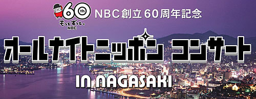 2012年2月18日(土) NBC創立60周年記念 『オールナイトニッポンコンサート IN NAGASAKI』 [会場] 長崎市公会堂 http://www.nagasakisi-koukaidou.jp/ (長崎県長崎市魚の町4-30) [開場/開演時間] 17:30/18:00 [料金] 前売り (全席指定) S席¥6,300 A席¥5,800 ※当日券は500円増しとなります。 ※3歳以上は、チケットが必要です。 [出演] 泉谷しげる / 夏川りみ / ビリーバンバン / 山本潤子 [チケット] 現在発売中 ■チケットぴあ 092-708-9001 【Pコード:154-382】 http://t.pia.jp/ ■ローソンチ