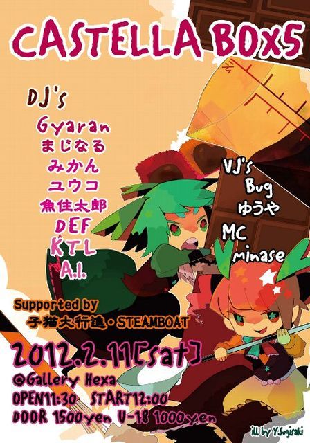 カステラボックスも2周年目! 今回も色々なゲストを呼んで開催します☆ 今回のゲストは・・・ 来崎2回目!秋葉原MOGRAよりGyaran もちろん福岡よりユウコ様降臨 同じく福岡からやっと来たぁぁぁ!みかん先生 熊本より、えぬぽでお馴染みのDEFッ そして、今年になって発表解禁となった MOGRAからのもう1人のゲスト、まじなる! 長崎初参戦のDELTAPOP主宰・魚住太郎! この2人も盛り上げてくれるよ! あ、長崎チームももちろんがんばるよ! DOOR 1500yen U-18 1000yen @gallery HEXA DJ's ・Gyaran(ANISO