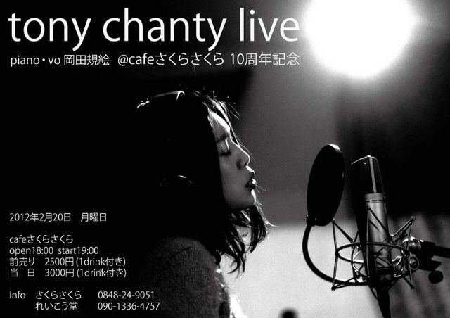 2012年2月20日 月曜日 cafeさくらさくら open18;00 start19:00 2500円(1d付き )前売り 3000円 (〃 )当日 info、前売り。さくらさくら 0848-24-9051 れいこう堂 09013364757 4,5年前から お世話になってる cafe さくらさくら 美味しいランチは素材を生かし味、無添加とかヘルシーとか言う前に お母さんの味です。食事後の珈琲はまた格別に美味いです。 手作りのチーズケーキは濃厚な美味しさ、 open10年ということで、 おしゃれで、清潔感溢れる店内と、装飾のシンプ