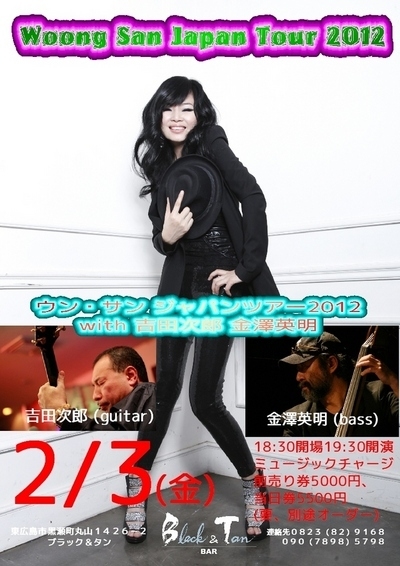2012/2/3(金) 「ウンサン ジャパンツアー 2012」 韓国ジャズ界を代表する、トップ ボーカリスト Woong San(ウンサン)がBlack&Tanに初登場! 艶やかさとスモーキーさを併せ持つ詩的ボイス、 独特の柔らかいオーラで聴衆を魅了する 最高のヴォーカリスト、Woong San。 2009年「Close Your Eyes」で スイングジャーナル誌選定ゴールドディスクを受賞。 日本のジャズ・ヴォーカルの中でも その実力を認められることとなる。 実力と美貌を兼ね備えたヴォーカリスト ウンサンの素晴らしいステージ 今回のツ