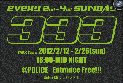 2012.02.12(sun) every2nd-4nd SUNDAY 333 18:00〜MID NIGHT ENTRANCE FREE!!! DJ TOMIKEN CHUCK-T SHINJI and DJ's