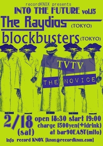 2/18(SAT) INTO THE FUTURE VOL.15 at 水戸bar 90EAST BAND: THE RAYDIOS(東京) BLOCKBUSTERS(東京) TVTV THE NOVICE CHARGE:1500YEN(+1 DRINK 500YEN) OPEN 18:30 START 19:00 遂にthe RAYDIOSが!! しかもBLOCKBUSTERSと一緒に!! これは一大事です。