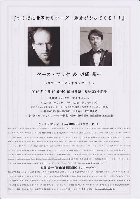 トロシンゲン音楽大学、チューリッヒ芸術大学などで教える世界的リコーダー奏者ケース・ブッケ氏とその愛弟子・辺保陽一とのリコーダーデュオコンサートです。フランス・ブリュッヘンやワルター・ファン・ハウヴェなどと共にリコーダー界をリードしてきた、世紀の大天才のコンサートです。ぜひお聴き逃しなく! 『つくばに世界的リコーダー奏者がやってくる!!』 ケース・ブッケ & 辺保 陽一 〜リコーダーデュオコンサート〜 2012年2月10日(金) 19時開演 18時30分開場 茨城県つくば市 アルスホール (TX終点「つくば駅」下車、A2出口から