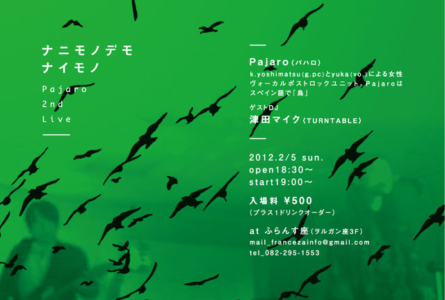 ふらんす座ライブ 「ナニモノデモナイモノ -Pajaro 2nd Live-」 2/5(sun.) オープン18:30〜 スタート19:00〜 入場料 \500(プラス1ドリンクオーダー) at ふらんす座(ヲルガン座3F) mail:francezainfo@gmail.com tel:082-295-1553 Pajaro(パハロ): k.yoshimatsu(g.pc)とyuka(vo.)による女性ヴォーカル ポストロックユニット。Pajaroはスペイン語で「鳥」 ゲストDJ:津田マイク(TURNTABLE)