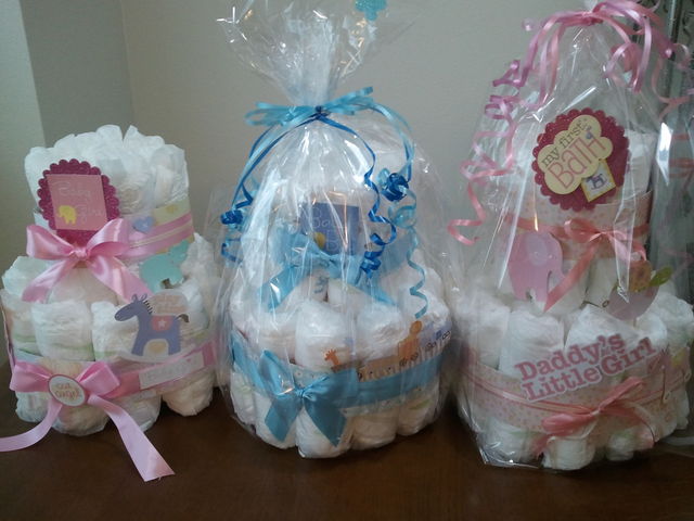 もうすぐまたは、最近赤ちゃんが産まれた大切な方への出産祝いにおむつケーキを作成してプレゼントしてみませんか? おむつケーキは購入すると高いのですが、本レッスンではお手頃なお値段で提供して頂けます。 <おむつケーキとは(wikipediaより> 赤ちゃん用のおむつを束ねて装飾をほどこし、あたかもデコレーションケーキのような見栄えにしたものをいい、赤ちゃんの誕生祝いに際しての贈り物にされることがあります。出産祝いや前祝いのパーティーなどで実用的でかわいらしいとの事で贈り物になること、又日本の産婦人科病院では生花をお祝い
