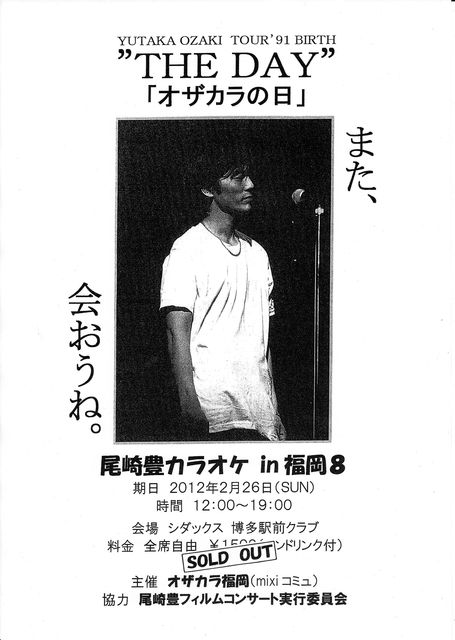 『尾崎豊カラオケ in福岡8』 期日:2月26日(日) 場所:シダックス 博多駅前クラブ 時間:12:00〜19:00 料金:1500円(ワンドリンク込み) お待たせしました!福岡で唯一(らしいw)のオザカラ「尾崎豊onlyカラオケ」イベントの第8弾の開催です♪ 今回の特別企画は…かつてない迫力「大画面オザカラ」+プレ尾崎フィルコン支援企画「尾崎ライブ上映会」またまた両方いっぺんにまとめてやっちゃいますSP!(笑) 尾崎ファンはもちろん、尾崎豊に興味がある人、カラオケ苦手だけど聴く側参加したい人も大歓迎!! オフ