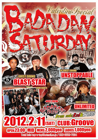 2012.2.11(SAT) BADADAN SATURDAYーValentine Specialー @GROOVE 岐阜市柳ヶ瀬4-10 パチンコ OH 1億2F 058-266-1071 [SP GUEST SOUND] BLAST STAR from TOKYO UNSTOPPABLE from YOKOSUKA [GUEST SOUND] UNLIMITED from NAGOYA [HOST SOUND] BADADAN CREW [DANCER] CRAMBERRy FUNNY SHAKE YUKKO RIVADAN CREW [DRESS CODE] RED&WHITE [SOUND SYSTEM] M-13 soundsystem ADM/MENS:\2000 LADIES:\1000 OPEN 11pm ALL NIGHT [問] top-o-top@hotmail.co.jp