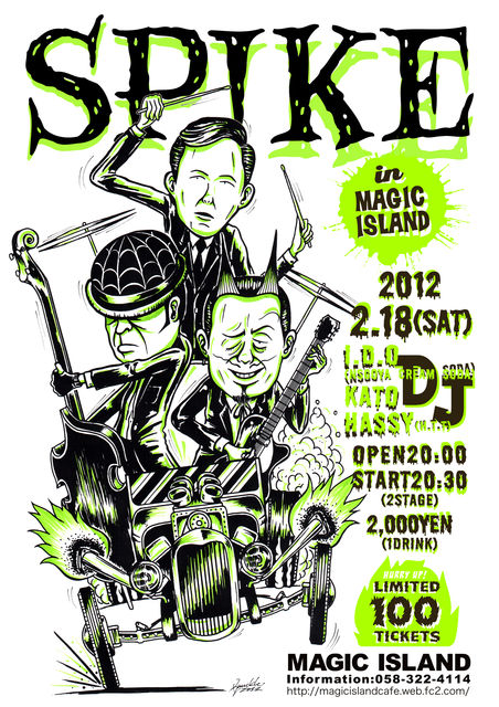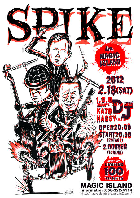 SPIKE ワンマンライブin岐阜 2月18日(土曜日) @MAGIC ISLAND http://magicislandcafe.web.fc2.com/ ¥2000(1Drink付) 限定100枚! OPEN 8:00 START 8:30 二部構成 前半カバー曲を中心に上京前(?)のネオっぽいSPIKE! 後半現在のRock'N'Roll Pcycho Monsters SPIKE! DJ I.D.O (NAGOYA CREAM SODA) KATO HASSY (H.T.T) チケット絶賛販売中! チケット販売店 MAGIC ISLAND 058-322-4114 NAGOYA CREAM SODA 052-251-1967 NINE LIVES 058-393-2644