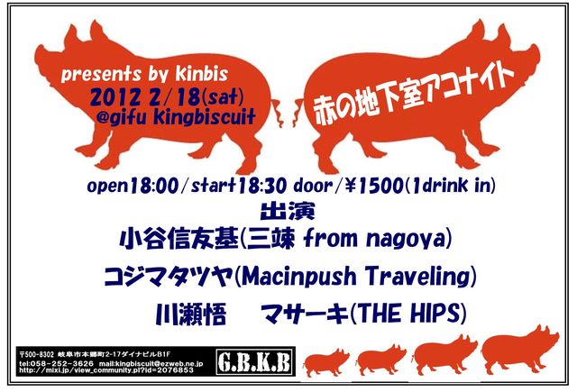 「赤の地下室アコナイト」 2012 2/18(sat) @gifu kingbiscuit 出演 :小谷信友基(三竦 from nagoya) :コジマタツヤ(Macinpush Traveling) :川瀬悟 :マサーキ(THE HIPS) andmore.......... open18:00/start18:30 door/\1500(1drink in)