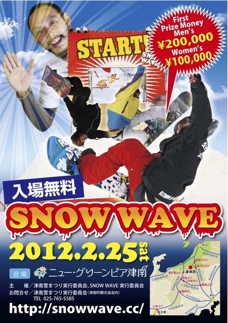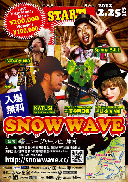 管理人様告知失礼します。 SNOW WAVE 2012 ●日時 2012年 2.25 SAT ●会場 ニューグリーンピア津南 (特設会場) 〒949-8313 新潟県中魚沼郡津南町秋成12300 http://www.new-greenpia.com/page_top/top.html TEL 025-765-4611 ●料金 入場無料(飲食の持ち込みは禁止させていただきます。) ●時間 9:00〜21:30 ●オフィシャルサイト http:// snowwav e.cc/ ●LIVE Spinna B-ill KATUSI from EL SKUNK DI YAWDIE Likkle Mai 青谷明日香 サブニュマ