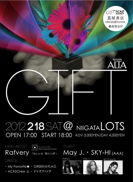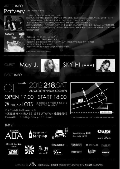 管理人様告知失礼いたします。 不適切でしたら、削除宜しくお願い致します。 来月2月18日に、現在アルビレックス新潟BBのオフィシャルソングを担当している 新潟在住ARTIST 『Rafvery』主催のイベントが開催されます!! 東京から、 May J AAAの日高光啓(SKY-HI) をゲストに迎え、 新潟から、USU aka SQUEZ SWAMP を迎え、 超豪華ゲストでのLIVE STAGEになります!!!! TICKETは、 ☆新潟県内の蔦屋書店・ひらせい遊TSUTAYA☆ で販売しております!! 近くに店舗がない方は、 info@gro