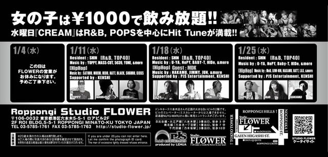 お客様、特に女性が主役のこのパーティーは女性入場無料だけでなくヘアブース、CDプレゼントなど女性から絶大なる支持を得ているので毎回大好評の数少ないDJ ONLY HIPHOP PARTYです。 毎回大盛況のこのパーティーをお見逃しなく!!