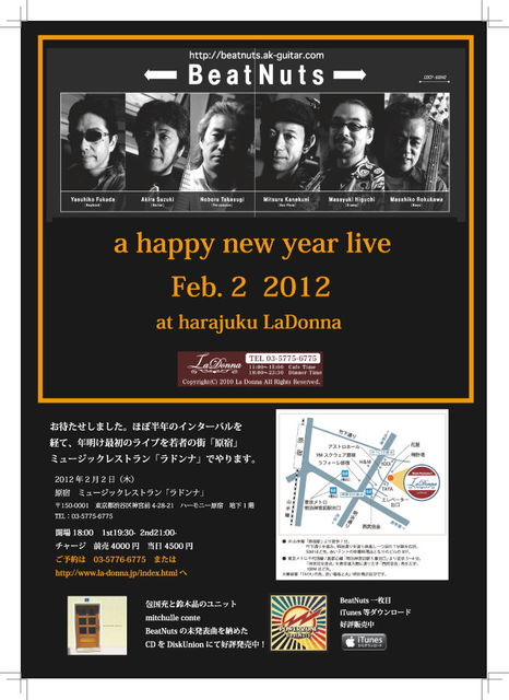 次回ライブ決定です。 2012 2/2(木)原宿 La Donna http://www.la-donna.jp/ 年明け最初のライブを若者の街「原宿」 ミュージックレストラン「ラドンナ」でやります。 a happy new year live です。 皆さん是非お越し下さい。 開場18:00 1st 19:30〜 2nd 21:00〜 チャージ 前売4000円 当日4500円 ご予約は 03-5776-6775 または http://www.la-donna.jp/ へ