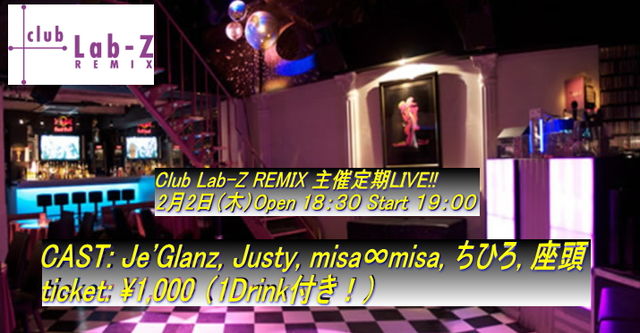 Club Lab-Z ¼çºÅÄê´ü¥é¥¤¥Ö¡ª £²·î£²Æü¡ÊÌÚ¡Ë 18:30 Open 19:00 Start Ticket \1,000 (1 Drink¹þ¤ß¡ª) ½Ð±é¼Ô¡§ Je'Glanz, Justy, misa¡çmisa, ¤Á¤Ò¤í, ºÂƬ ¤´Í½Ìó¡§tix@dolphin-entertainments.com ¤ªÌ¾Á°¤ÈËç¿ô¤ò¤´ÌÀµ¤Î¾å¡¢¤ª¿½¤·¹þ¤ß¤¯¤À¤µ¤¤¡ª