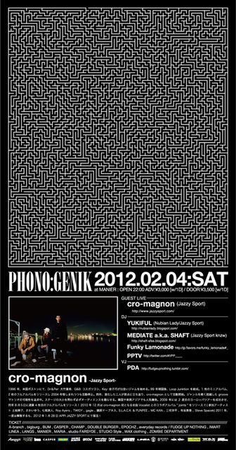 耳のPHONO端子から極上の音をInputし、迷路のごとく脳内を駆け巡り全身の細胞からOutput. そんなPHONO:GENIKのコンセプトにぴったりな、迷路が目印のフライヤーです。 Guestは復活したcro-magnon!! クロスオーオーバーなGood Music Only!!! "PHONO:GENIK" 2012.2.4(sat) OPEN 22:00 @MANIER ADV:3000yen (1D) DOOR:3500yen (1D) GUEST LIVE: cro-magnon (Jazzy Sport) DJ: YUKIFUL (Nubian Lady / Jazzy Sport) MEDIATE a.k.a. SHAFT (Jazzy Sport knzw) Funky Lemonade PPTV (Lomanchi) VJ: PDA (FUDGE