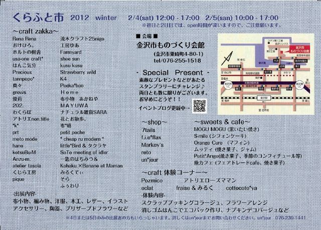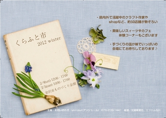 ◆開催日時◆ 2012年2月4日(土)12:00〜17:00 5日(日)10:00〜17:00 ◆場所◆ 金沢市ものづくり会館 (石川県金沢市粟崎町4丁目) http://ameblo.jp/sette1020