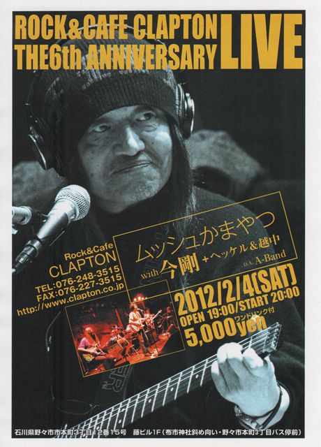 6周年LIVEいよいよせまる!! チケット好評発売中! このLIVEを見逃すな!! 2012年2月4日(土) PM7:00オープン PM8:00スタート 『 Rock&Cafe CLAPTON 6周年記念LIVE!』 ムッシュかまやつ with 今剛 & ヘッケル&越中 日本ロック界の大御所 ムッシュかまやつ 日本?1ギターリスト 今剛 オレンジ色の風の T−BIRD ヘッケル & 越中 オープニングAct A−Band 「Rock&Cafe CLAPTON」の6周年に大集結! 豪華にス