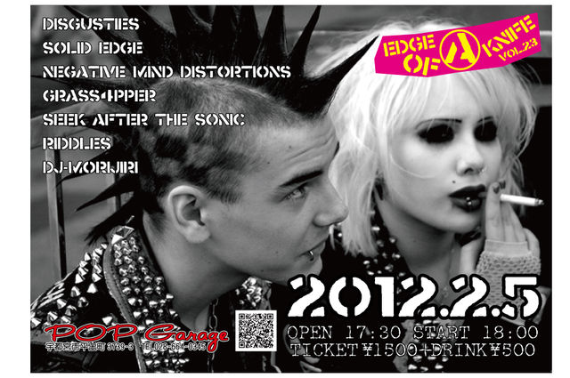 2012.2.5(Sun) 「EDGE OF A KNIFE Vol.23」 栃木県宇都宮POP Garage ◆出演◆ DISGUSTIES SOLID EDGE(東京) Negative Mind Distortions(東京) GRASS4PPER(東京) SEEK AFTER THE SONIC RIDDLE'$ DJ-MORIJIRI Open 17:30 Start 18:00 Ticket \1500+Drink\500