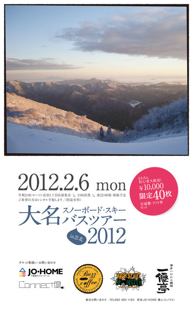 この1年間、ずーっと温めてた企画を開催致します。 「第1回 大名スノーボード・スキーツアー 2012」 当日は大型バスをチャーターし、大勢でワイワイ騒ぎながら楽しみたいと思います。 行先は「恐羅漢」(※天候や交通状況により変更もあります) あの周辺では唯一自然の雪に囲まれたスノーパラダイス。人も少なく傾斜も緩やかで初心者の方には特にオススメ!! 上級者や腕に自信がある方はご存じですよね、ハードなコースもバライティにとんでしっかり楽しめると思います!! ※レン