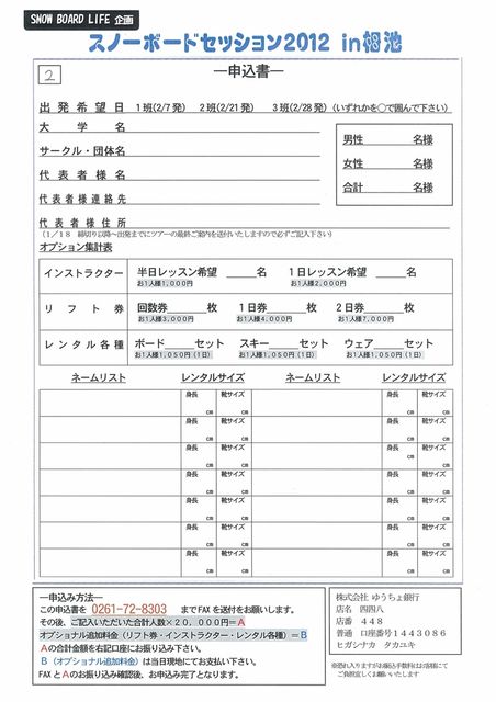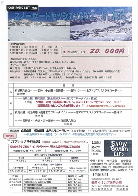 料金は基本料金が2万円、リフト券は別ですが、 割引価格で購入して頂けます 。 ビンゴ大会は無料で1ドリンクサービスです♪。 バスは京都駅から火曜の夜に出発し、朝7時に栂池高原に到着、帰りは木曜の夕方に栂池高原を出発、夜11時頃京都駅到着予定です(^-^) ツアーは三回行いますので、都合の良い日をお選びいただき、添付のチラシを印刷後、必要事項を明記の上、ファックスお願いします♪ その他質問ございましたら、気軽にお尋ねくだ さい。 拡大したチラシはアルバムにもありますのでご覧ください♪