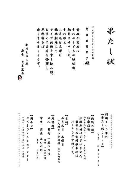 果たし状ライブ 第3弾! 今回は ジャグミュージックの重鎮 【Mooney】さん を迎えてのライブです。 横浜からジャグ王が やってきます!!! ヒロシ軍とのバトル お楽しみに! NK3DreamPro.presents! 劇団ヒロシ軍の 『果たし状 Live vs Mooney』 2月9日(木) 19:30開演 (19:00開場) 諫早 独楽劇場にて (諫早市八天町15-4) 前売り 大人1500円 学生500円 (当日300円増) お問い合わせは ワタナベ まで <(_ _)>